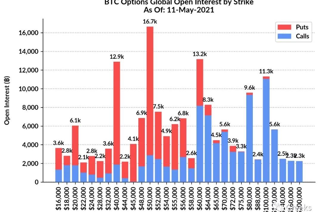 播報數據由Greeks.live和Skew.com提供。外圍全球資本市場整體下跌,馬斯克停止比特幣支付特斯拉,一個又一個的壞消息終于壓垮了比特幣的盤面,一天內下跌達20%,這次暴跌幅度是本輪牛市中最深的一次。比特幣現在新進資金不足,50000美元艱難守住。期權成交量20億美元,期權持倉量為102億美元。10d74%30d73%90d72%1Y68%各標準化期限隱含波動率:今日:1m90%,3m87%,6m86%,DVol90%5/11:1m75%,3m78%,6m80%,DVol86%比特幣暴跌拉起了全期限IV,但目前比特幣IV的上升幅度明顯還不夠,不出意外今天IV還將會持續上升。市場追逐的熱點多數熄火,中期平值期權購買成本尚可接受,抄底可以考慮。