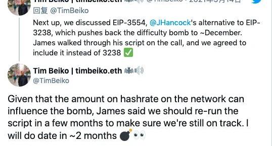 5月14日,以太坊核心開發者進行電話會議,以太坊開發者TimBeiko更新會議結果表示,會議的大部分時間都集中在解決倫敦升級的最終細節。倫敦升級將納入EIP-3541、EIP-3554。其中EIP-3541阻止部署以“0xEF”開頭的合約,為大規模EVM檢修奠定基礎;EIP-3554提議將難度炸彈延遲到12月。此外,會議討論了測試網進行倫敦升級的時間,Ropsten定于區塊高度10399301,Goerli定于區塊高度4979794,Rinkeby定于區塊高度8813188,主網仍定于7月14日進行升級,在第一個測試網成功分叉后,再確定主網客戶端升級區塊。關于此次難度炸彈延遲的計算是由以太坊核心開發人員JamesHancock提出的。“難度炸彈一直都在,我們只是把它的blocktime往回撥了些,以此來暫時‘拆除’炸彈,”Hancock告訴Decrypt。他提議將炸彈推遲9700000個區塊。