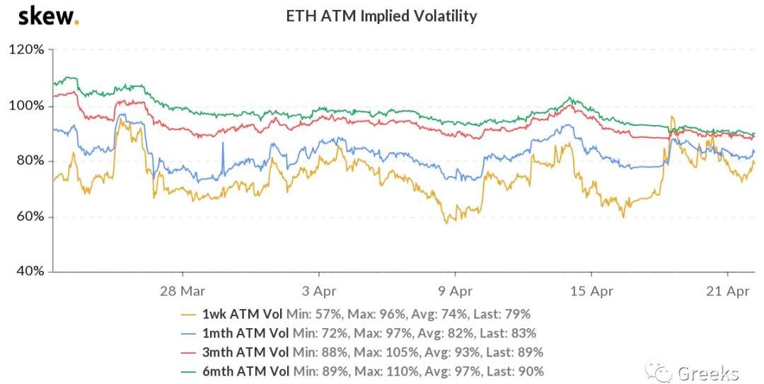 以太坊今日期權成交量2.55億美元,持倉量37億美元。10d88%30d88%90d105%1Y90%各標準化期限IV:今日:1m82%,3m88%,6m90%4/21:1m83%,3m88%,6m90%以太坊的IV近兩周呈現一個平滑下跌的趨勢,Skew則呈現震蕩回歸,現在以太坊依靠著DeFi的鎖倉和挖礦維持著比較強勢的勢頭,但像Fei之類的巨無霸項目會始終成為一個隱患。