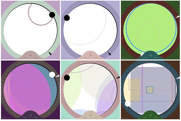 計時器的例子。沒有多少鏈上NFT的主人計時器上的元素會更少,更簡單,更安靜--就像上面那一行。那些有更多的鏈上NFT的人將會在他們的計時器中加入更多的元素,就像下面這一排所示。高斯表有一個主指針(圓圈),根據固定的時間繞著表圈運行。但在這塊表的周圍有一些復雜的東西,包括:計時變化的代表(表圈內側的月牙),所有者的鏈上NFT(表圈上的標記),一個動態的移動元素的 "表盤",以及一個真正的、實際的一天的時間的標記(UTC時間12小時鐘,表圈外側的三角形)。與計時器相關的區塊號碼顯示在計時器的區塊計數下面(例如,在 "+2 "下面),星號 ""顯示當前的gas價格,增量為25(上限為300gwei)。顏色和表盤隨著每個周期的區塊時間更新。詳情見下面的內容。*