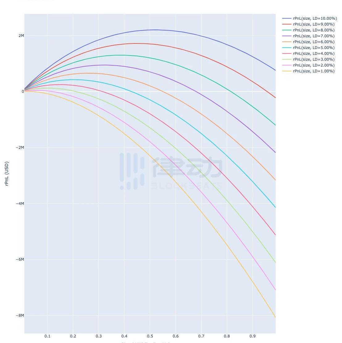 這個方程與原來的ePnL函數相同,只是現在采用了代表整體市場狀況的參數Market,如價格變動和波動性。如上所述,Market是LD的參數,LD現在是一個取決于協議的函數,可以使用拍賣模型或先到先得清算模型。Slippage和Risk也受到市場的影響,必須更新。例如,在市場暴跌時,流動性可能會枯竭,并導致因退出大額頭寸而增加的滑點,以及由于市場的更高波動性而增加的風險競爭性協議