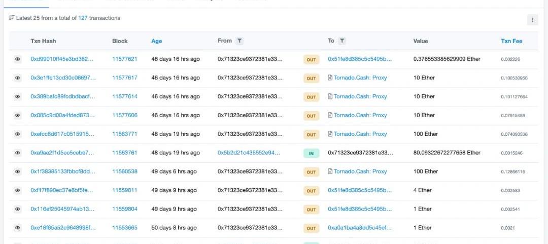 第二步,對已知項目發布者地址進行查詢。目標是查詢該地址發布的所有交易歷史記錄的哈希值。通過查詢,DarkMatter項目發布者地址所有交易歷史記錄如下圖所示: