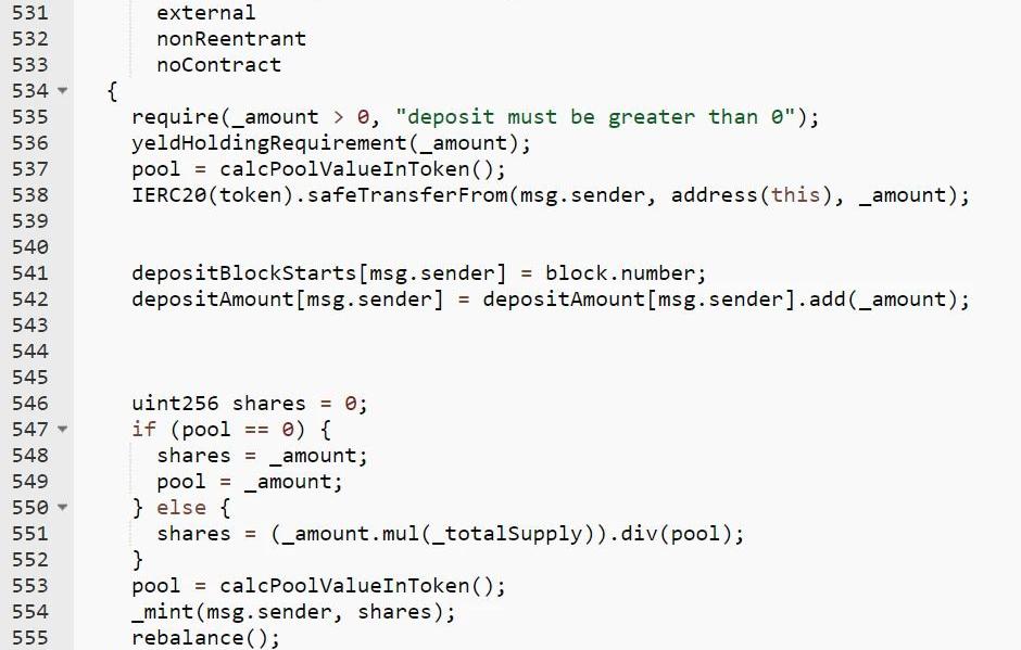 △圖2deposit函數源代碼很明顯,第538行代碼,產生導致了序號為T1的代幣轉移,將token轉移到yDAI合約。這是一筆普通的代幣轉賬,表示用戶存入了9,377DAI到yDAI合約。第541-553行代碼,是yDAI合約用于計算用戶存入的DAI應返回給用戶多少yDAI,并在第554行進行鑄幣,對應序號為T2的代幣轉賬,表示yDAI合約向用戶鑄了9,306yDAI。然后進入第555行的rebalance函數,分析該函數的邏輯。