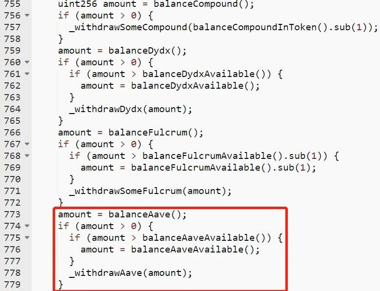 △圖5recommend查詢結果其中dYdX池的APR最高,newProvider被設置為dYdX池。當前池為AAVE池,進入736行的if代碼塊,調用內部函數_withdrawAll。