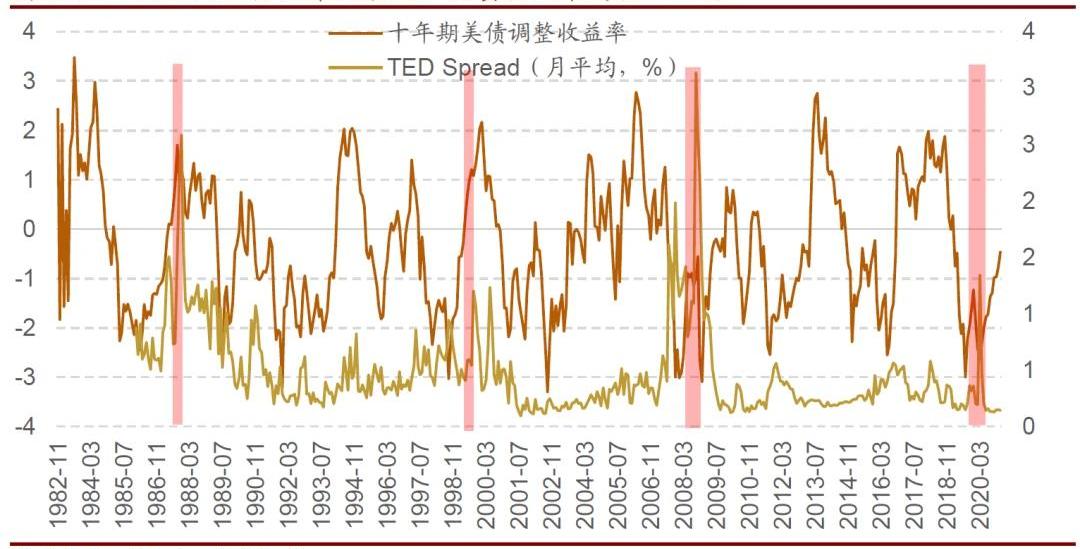 ■美國貨幣政策力度當經濟下行、失業率攀升時,美國貨幣政策會相對寬松,體現為降息或者增加量化寬松規模;反之則會加息或者減少量化寬松規模。■流動性沖擊當美國或者全球股票市場遭遇外部沖擊出現大幅下跌時,由于贖回需求、杠桿資金平倉、補倉等需求大幅增加,會使得投資者拋售一切資產來獲得美元應對流動性需求。此時,會出現短期流動性的大幅增加,體現為TedSpread與三月期美國國債利率之差)短期內大幅飆升,此時,十年期國債作為一種資產,也會無差異被拋售,造成十年期國債利率的大幅回升。歷史上,較為著名的流動性沖擊有“1987年10月股災”、“1997年亞洲金融危機”、“2008年次貸危機”、“2020年新冠危機”。