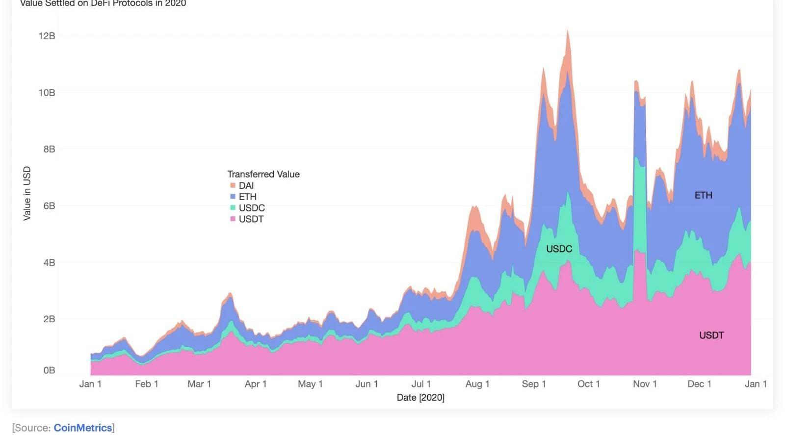 根據ConsenSys的報告,去年以太坊上穩定幣的交易量超過了1萬億美元。2020年,最受歡迎的穩定幣Tether在以太坊上結算了5800億美元,而ETH的交易量僅為3850億美元。報告顯示,截至今年1月1日,74%的穩定幣在以太坊發行,價值約200億美元。而且這些穩定幣的種類已經從以前主要由法幣支持的穩定幣演變為許多“新類型”的穩定幣,如加密貨幣擔保的穩定幣、計息穩定幣、合成穩定幣和算法穩定幣(如AMPL、yUSDC)。