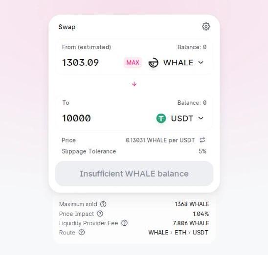 我們專門找一個最近熱度較高,但是體量不大的幣種Whale作為例子。Whale-USDT,然后將USDT這里隨意輸入一個數字,比如10000USDT,這時候滑點是1.04%,這時候可以用計算器這么計算:10000÷1.04%*2=192.3萬美金。但是這么算還需要計算器,那么,直接手動調整下USDT的數字,直到滑點顯示為1%,如下圖所示: