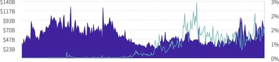 2020全年DEX交易量占比,來源:TokenInsight2020年下半年,去中心化交易所成交量占比由7月1日中心化交易所現貨成交量的0.2%最高增至9月中旬的3%,并在12月份的大部分時間內維持在了1%以上。而該占比在2020年上半年年初僅為約0.01%。