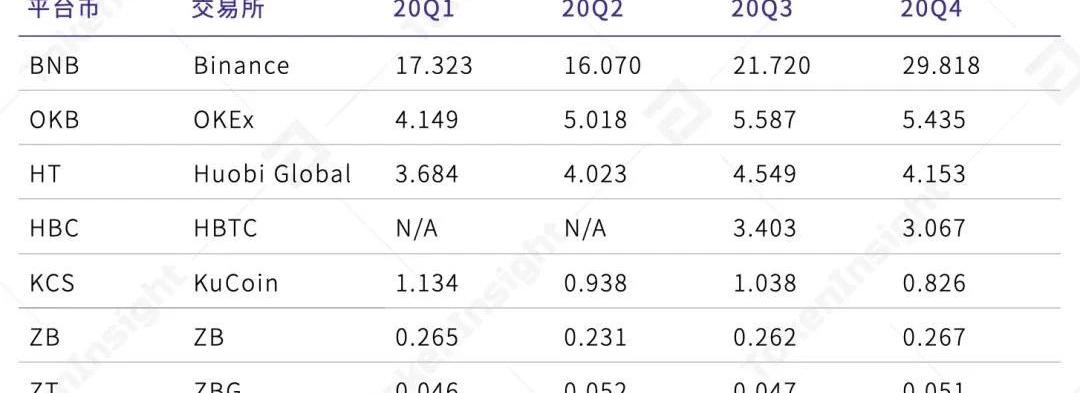 2020年主流平臺幣季度均價,來源:TokenInsight4.2平臺幣分析“312”事件是平臺幣全年表現的分水嶺。2020年3月前,主流平臺幣表現多好于比特幣,其中OKEx平臺發行的平臺幣OKB相較于1月初,漲幅一度達150%,為各平臺表現最佳。但在“312”事件后,受市場恐慌因素影響,主流平臺幣價格跟隨主流數字資產發生大規模下滑,部分平臺幣價格甚至低于1月初。盡管市場于Q2、Q3逐步回暖,但此時,平臺幣走向開始發生分化。以BNB、OKB、HT為代表的大型交易所平臺幣,在年中市場大規模震蕩后表現良好,其相對年初漲幅一直保持在比特幣之上,并緊跟牛市行情,盡管其價格漲幅并未達到與比特幣類似的高水平,但BNB、OKB均在年底達到全年最高位,相較于年初上漲近200%;與之相比,HT在Q4表現較為平平,全年漲幅穩定在50%左右,但仍好于KCS、ZB等平臺幣。而其他主流平臺幣則在“312”事件后表現乏力,全年走勢大部分時間遜于主流數字資產,部分交易所甚至出現破發。究其原因,大型交易所抗風險能力相對較強,因此市場共識較為集中,其價格的穩定與上漲背后,是投資者對其所代表的交易所價值的肯定。而對于規模較小的交易所而言,市場共識則較為缺乏,故即使數字資產于后半年進入牛市,其平臺幣價格依舊難以抬升。