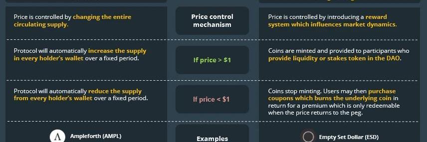 為了解決缺乏非抵押穩定幣的問題,有幾種協議試圖創建經過算法調整的穩定幣,以確保其價格保持在1美元。這些協議通常可以分為兩類:Rebase模型,如Ampleforth(AMPL);Seigniorage模型,如EmptySetDollar(ESD)。