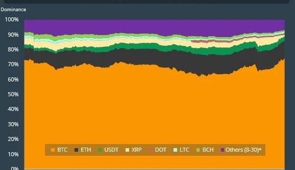 *截至2021年1月1日,前五大加密貨幣不包括Tether**Polkadot僅于2020年8月19日開始交易ETH今年表現出色,增長了472%,在2020年的表現優于其他前五大加密貨幣。緊隨其后的是比特幣,其漲幅達到303%,打破了其2020年12月的歷史高點。DOT于2020年8月推出,以219%的增長率迅速成為前五大加密貨幣之一。其次LTC2020年增長214%,瑞波幣2020年增長14%。3、2020年前30加密貨幣主導優勢:以太坊超過比特幣