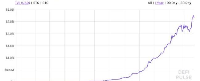 即便DeFi主要與以太坊生態系統相關,但近年來也有一些項目致力于將比特幣作為合成資產映射到其他區塊鏈上。到目前為止,最流行的是WBTC,它是一種有比特幣支撐的ERC-20代幣,可以在基于以太坊的DeFi協議(如Uniswap和Compound)上使用。目前,超過12萬枚比特幣被鎖定在WBTC中,比去年增長4000多倍,價值超過30億美元。