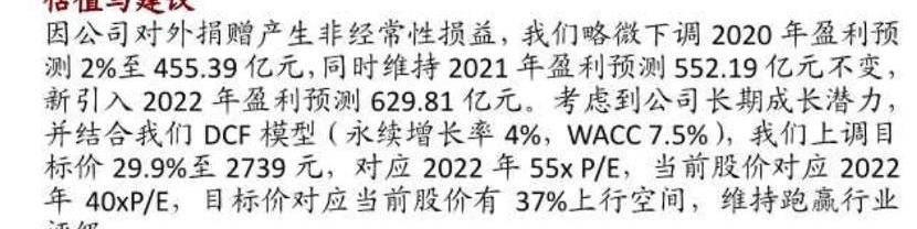 但茅臺可是醬香型科技啊,可以說是信仰了,自然不能用什么1、2年的業績算估值,這至少咱茅臺肯定能長期經營下去吧。所以必須用到公式右半部分,咱用DCF模型算一算。當然我們不要自己算,很多人幫忙算的,比如中金最新關于茅臺的報告中,用DCF一陣算。得出了2739的目標價。