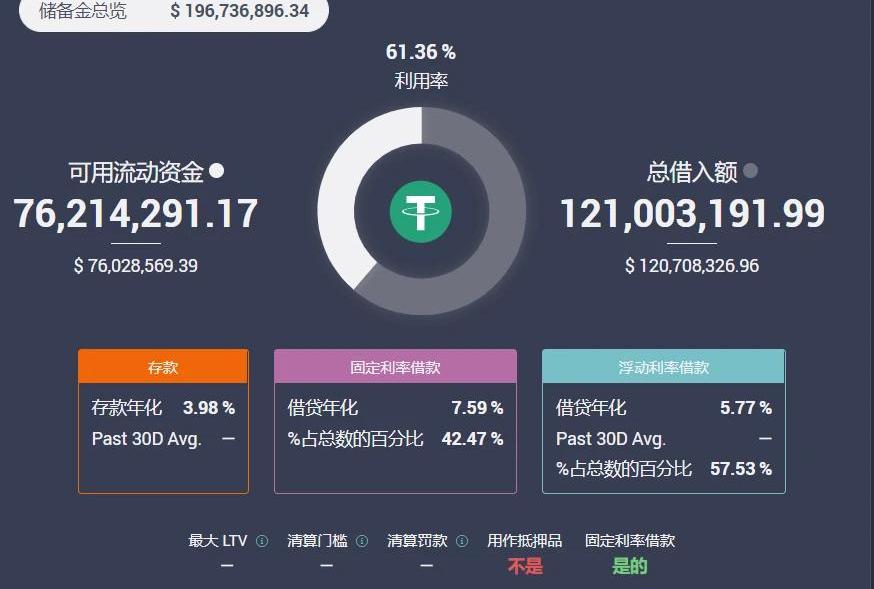 Aave內的固定利率并非是絕對固定的,在極端情況下利率可能再平衡。再平衡的條件為:當平均借貸利率低于25%,并且利用率超過95%時,將會發生利率再平衡,利率將會發生變化,但從目前的情況看出現再平衡的幾率不大。在Aave內我們可以看到每種資產的相關數據,其中包含了固定利率借款的占比份額。從目前來看AaveV1內固定利率借款占比較高的是USDT、USDC和DAI,占比分別為42.4%、27.6%和15.9%。但如果單從V2版本來看,USDT、USDC和DAI的占比分別高達56.7%、57.9%和67.2%。