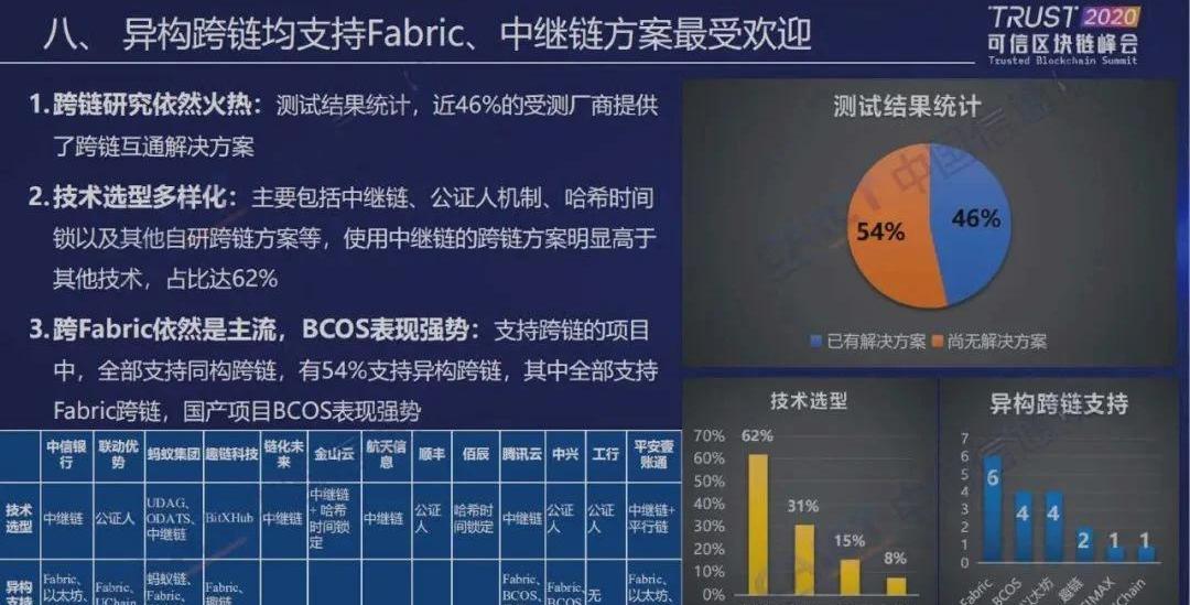 觀察八、跨鏈互通:異構跨鏈均支持Fabric、中繼鏈方案最受歡迎跨鏈是必須的,很多時候不可能一個鏈通吃所有的應用,所以必須跟別人考慮怎么互聯互通。今年測試的項目中,已有46%的鏈系統支持了跨鏈互通。在技術選型上,采用中繼鏈方案占比62%,位居首位,其次為公證人方案,占比31%,異構跨鏈底層鏈支持方面,Fabric支持率最高,其次為FISCOBCOS、以太坊、HyperChain等。