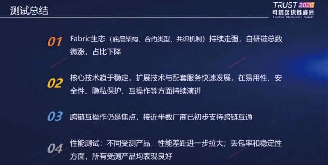 總結下來,Fabric生態持續走強,自研鏈的總數微漲,占比下降。核心技術趨于穩定,現在的技術創新集中在易用性、安全性、隱私保護、互操作等。跨鏈互操作仍然是焦點,現在大家越來越重視,接近一半廠商開始初步支持互通,但是道路非常艱難,對于大范圍的互聯互通,相對于現有NxN的適配對接復雜度,我們更需要通過一系列的標準規范,制定出對應的區塊鏈世界標準語言,并推出相應的跨鏈基礎設施,因此TBI在峰會上發布了“可信鏈網”,就是要把NxN的復雜性變得簡單一些,希望“適配一次,到處可通”。第四是性能測試,中位數與最高值差異很大,說明不同鏈系統的性能差距逐漸拉大。