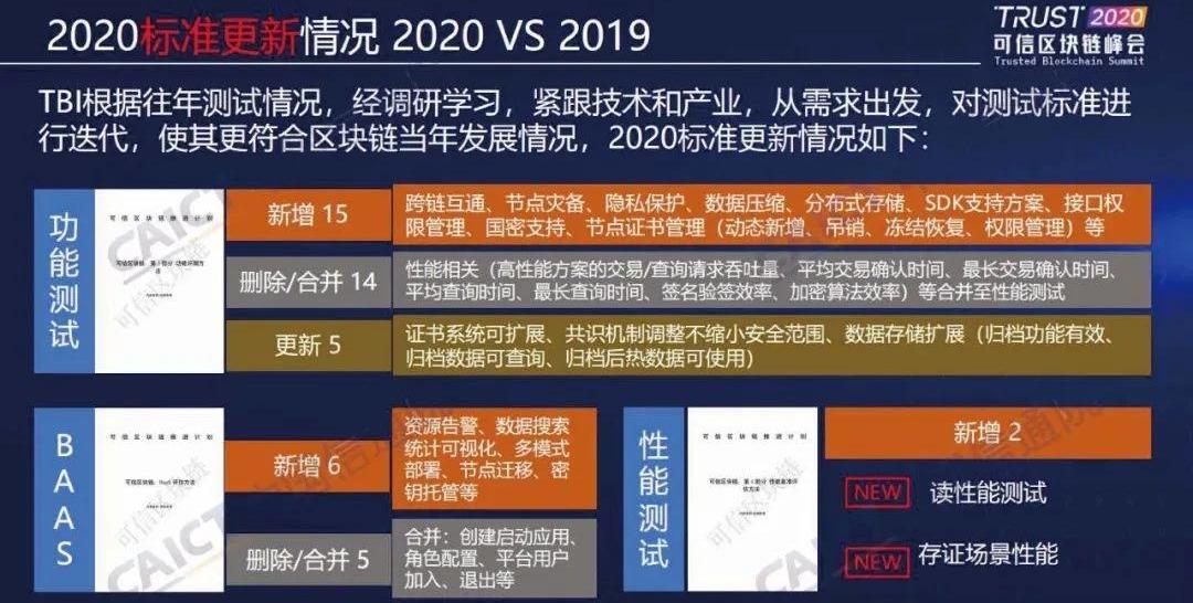 在測試標準更新方面,通過對技術產業的研究,可信區塊鏈推進計劃從需求出發,對2020年測試標準進行了迭代更新,其中功能標準新增15項,刪除/合并14項,更新5項;BaaS標準新增6項,刪除/合并5項;性能測試新增2項,包括讀性能測試和存證場景性能測試。
