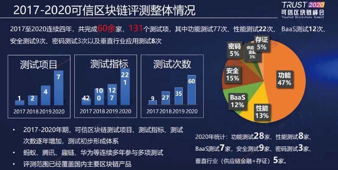 2017-2020年可信區塊鏈評測整體情況來看,連續四年,共完成60余家,131個測試項,其中功能測試77次、性能測試22次、BaaS測試12次、安全測試9次、密碼測試3次以及垂直行業應用測試8次。四年間,可信區塊鏈測試項目、測試指標、測試次數逐年增加,初步形成涵蓋基礎功能、性能、安全、密碼、BaaS、存證應用、供應鏈金融應用、溯源應用,共計8個門類的測試體系。螞蟻、騰訊、趣鏈、華為等連續多年參與多項測試,評測范圍已經覆蓋國內主要區塊鏈產品。