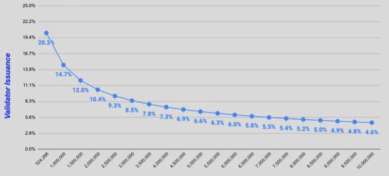 轉機發生在最后截止日期的前兩天,即11月23日、24日,兩日總質押量達到42.1萬ETH,占比接近80%。ETH質押數量為何飛速增?這些質押的ETH又主要來自于哪些市場角色?簡單來說,主要有三類人:以太坊開發者,其中以V神為代表;以太坊大戶和技術愛好支持者;看好以太坊發展的機構支持者進入。更多內容,推薦閱讀《誰在幫助ETH2.0按時達成質押目標?》另外一個問題是,成為驗證者參與Eth2.0質押,收益多少?根據官方公布的數據,隨著參與數量的增加,POS收益將從啟動時期的20.3%下降至4.6%,如下所示: