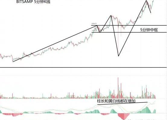 30分鐘K線顯示:形成30分鐘中樞并強勢突破,以現在走出來的MACD柱長判斷,沒有形成背馳,不會反轉。