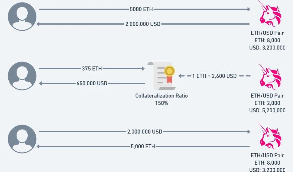 XRP/HKD+2.08%想象一下,你使用去中心化的借貸平臺。用戶可以將資產作為抵押品存入平臺,也可以借入其他資產,但最高金額取決于他們存入的資產的價值。讓我們假設一個用戶想用ETH作為抵押品借入美元,ETH的當前價格是400美元,抵押比率是150%。如果用戶存款375ETH,意味著存入了150,000美元的抵押品。他們可以每1.5美元的抵押品借入1美元,所以他們可以從系統借入最多100,000美元。