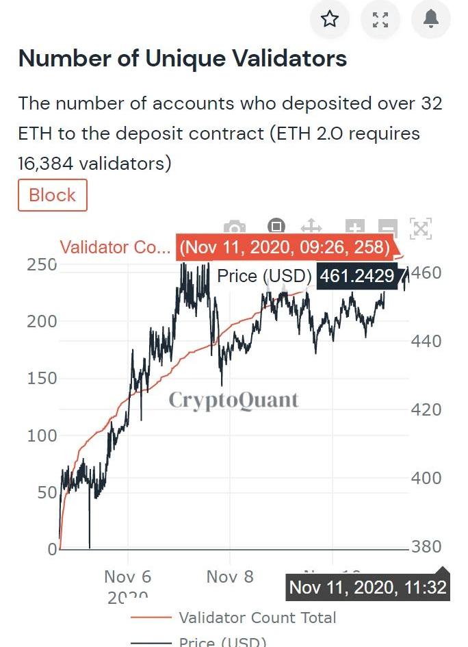 信息來源:推特“過去三天,平均每天有2100枚ETH被質押。要在12月1日啟動,從現在開始到11月24日,我們需要每天質押32000枚ETH。按照目前的速度,創世無法在2021年6月前啟動。”推特上一個叫做“eth2validators”的用戶針對ETH2.0進度發出了如上警告。確實,相對于ETH2.0存款合約上線初期的幣價飆漲,和一天2萬多枚的質押量,現在ETH2.0的質押活動已經滯緩下來。ETH2.0創世啟動期為25天,6天過去了,ETH的質押進度才達到10%。截至撰稿時,獨立驗證者數量為258個,驗證者節點數量是1691個,距離2.0啟動所要求的16384個驗證人還有很大的差距。