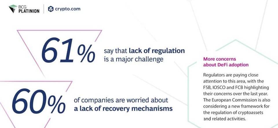 61%的受訪公司認為缺乏監管是一大挑戰。60%的公司擔心缺乏追償機制。更多關于采用DeFi的顧慮監管機構正在密切關注這一領域,金融穩定委員會(FSB)、國際證券會組織(IOSCO)和FCB在去年強調了他們的關切。歐盟委員會也在考慮制定新的加密資產和相關活動的監管框架。在實施DeFi的公司中,39%的公司正在使用現有的聯盟、平臺、應用程序或服務來協作實施DeFi