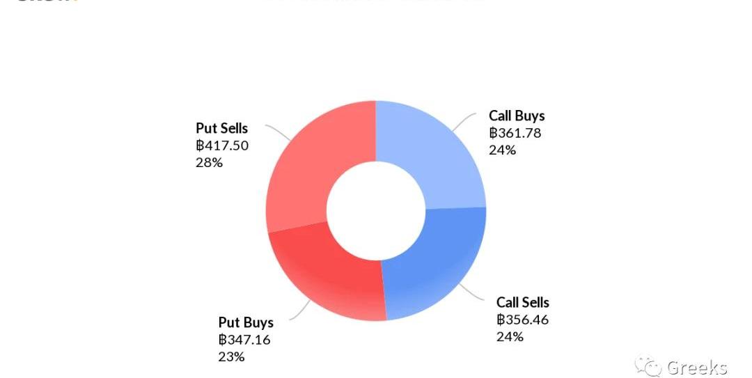 以太坊幣價波動和比特幣接近,經歷了昨天短期IV大幅波動后,市場回歸穩定,IV繼續小幅下跌。今天Call賣出量占比很大,CallSells成交2546ETH,占總成交量的46%,昨日CallSells天量成交超過15000幣。今天成交量實際上低于平日,但是另外幾個方向的成交仿佛在今天戛然而止,市場觀望情緒濃厚。