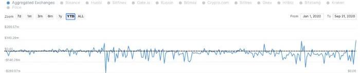 在過去的兩年中,Ethereum上記錄的Tether的鏈上交易量從每天50萬美元增長到每天超過35億美元,增長了7000倍。這使得穩定幣鞏固了自己作為市場第三大加密貨幣的地位,并超過了比特幣和PayPal的日交易量。隨著Tether和穩定幣交易需求以這樣的速度增長,銀行很有可能希望開始持有他們的抵押品,以從這種日益增長的趨勢中獲益。通過跟蹤穩定幣進出交易所的存款和提款,我們可以更好地了解它們被用于什么類型的活動。IntoTheBlock的NetFlows指標用來測量流入交易所的資金減去流出交易所的資金,以計算進入/離開交易所的凈額。在下圖中,我們可以看到,Tether的凈流量一直是負數。