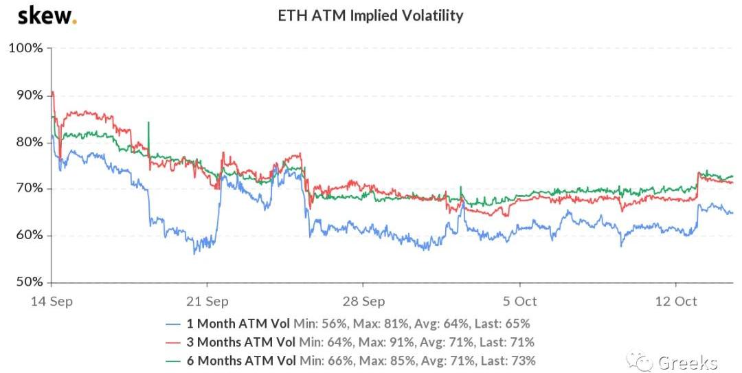 ETH歷史波動率10d45%30d69%90d85%1Y103%以太坊今日期權持倉量3.86億美元,成交量930萬美元。各標準化期限IV:今日:1m65%,3m71%,6m73%10/13:1m65%,3m72%,6m74%