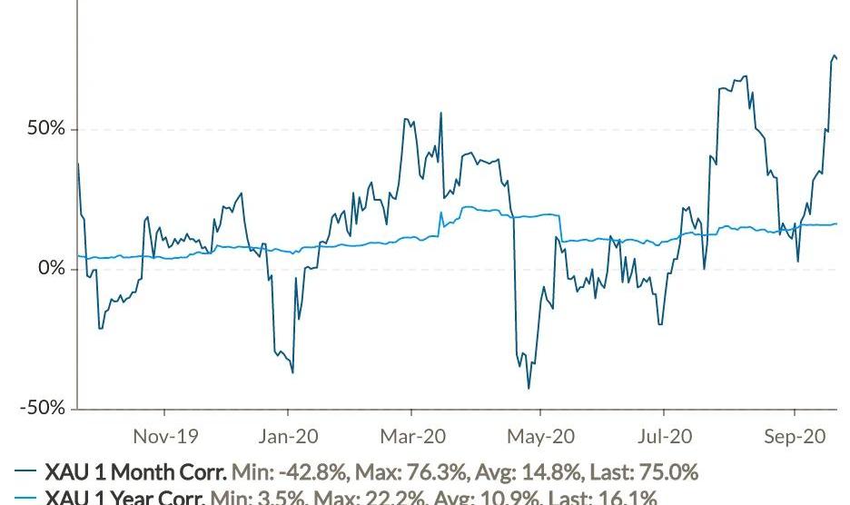 4、數據:比特幣和黃金的關聯性達到一年高點Skew數據顯示,9月下旬比特幣和黃金之間的關聯性達到了一年以來的最高水平。兩者關聯性的增強可能表明,更多投資者正在將BTC視為價值存儲。比特幣價值存儲功能,正在受到越來越多投資者的認可。