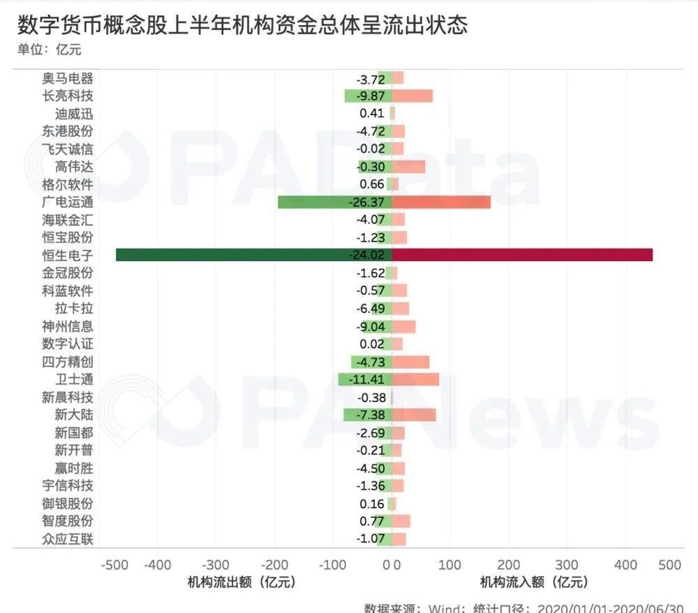 上半年,機構資金從數字貨幣概念股共計流出123.7億元,與4月熱潮期間凈流入2.7億截然相反。27只概念股中只有5只個股上半年的機構資金流向為凈流入狀態,包括智度股份、格爾軟件、迪威迅、御銀股份和數字認證。但這些概念股的機構凈流入資金都不超過1億元,最多的智度股份也僅凈流入了0.77億元。