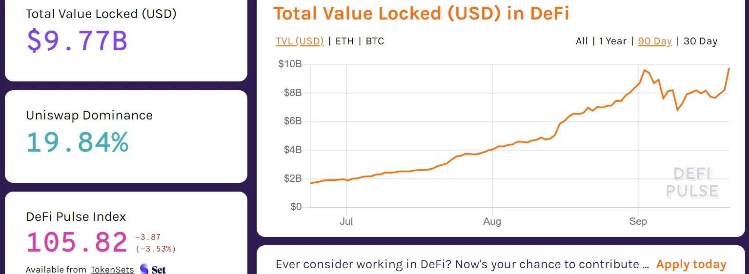 從鎖倉量方面來看,據DeFiPluse數據顯示,DeFi項目鎖倉價值高點出現在9月2日,為96億美元;到9月20日,當前鎖倉價值為97億美元,略有增加。