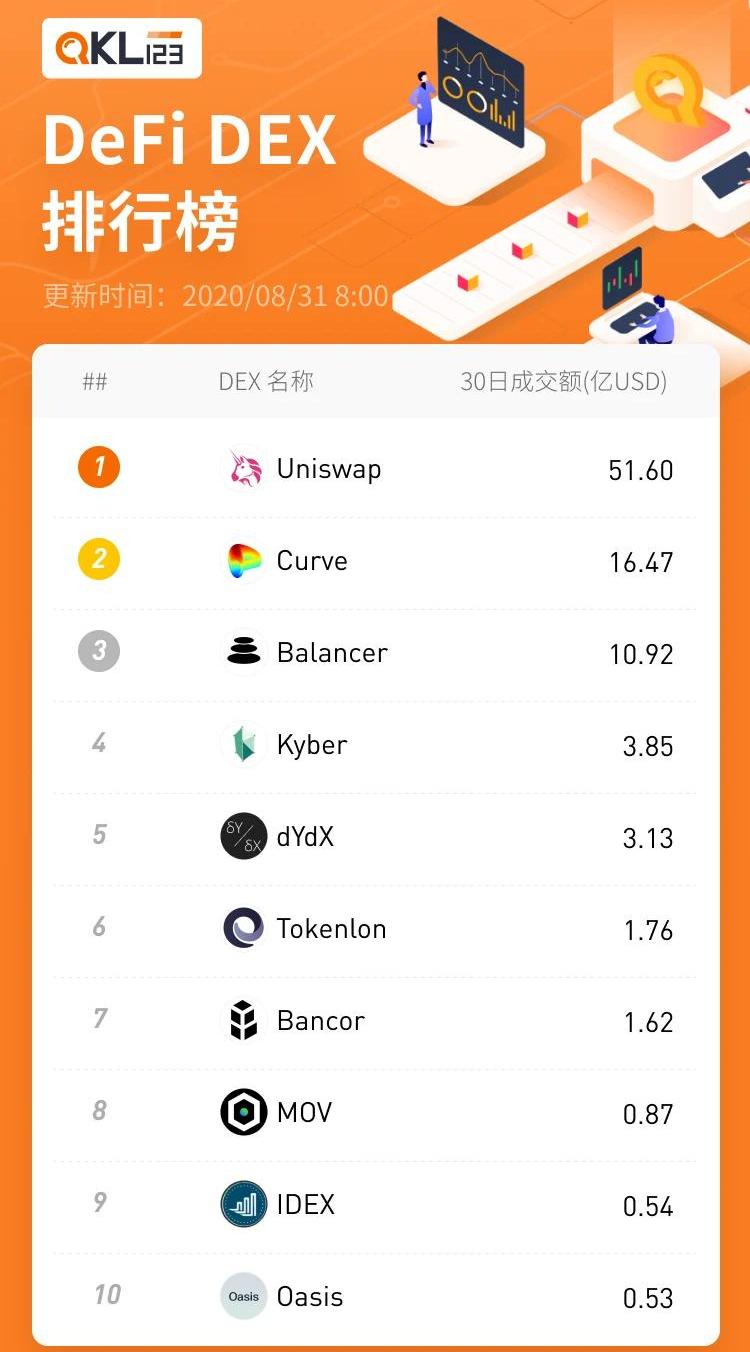 數據來源:QKL123上圖為8月以來Coinbase和Uniswap成交量的走勢圖,從圖中可以看出,Coinbase成交量整體呈下行趨勢,UNI成交量呈上漲趨勢;此外,在比特幣波動大的時候對中心化交易所Coinbase的影響特別大,尤其是8月2日比特幣放量下跌和8月21日比特幣創短期新高的時候,成交量也隨之劇增,或者說Coinbase本身是比特幣美元市場的代表,也是行情的發動地,價量關系高度相關。另一方面,流動性挖礦不斷沖擊著CEX的成交量,推高DEX的交易需求,8月末YFI和YFII等聚合器的治理代幣暴漲以及Sushi開啟挖礦使DEX交易量達到短期高潮,并于最后一日UNI的交易量超過Coinbase的成交量,在DEX行業或許是一個里程碑事件。榜單TOP10DEX成交量走勢圖2-4榜單TOP10DEX成交量