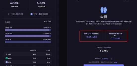 已上線sUSD相關交易對的平臺既然有更直接獲取sUSD的方式,那為什么還有人會去抵押SNX?因為抵押SNX可以幫用戶獲得額外獎勵。抵押者鎖倉獲利Synthetix的代幣模型有三個特點,使用通脹模型鼓勵SNX持有者鎖倉坐莊,通過獲取收益和取回質押物托底SNX價格,以及借助流動池獎勵促進合成資產與真實數字代幣的錨定。為此SNX增發的代幣和合成資產每筆交易收取的0.3%手續費會按比例定期分發給質押者。以哈希派的實踐為例,在目標抵押率為600%的情況下,質押4.9枚SNX在Synthetix網絡一天,可獲得0.01sUSD以及0.03SNX的交易獎勵和新增代幣獎勵。