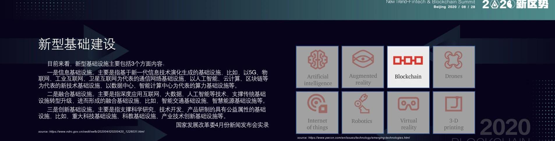 創新帶來的影響不僅僅你手上有個新工具,創新影響到我們對一些事情的體驗、感受和參與。傳統的陶藝,如果換成了3D打印,這個參與感是完全不一樣的。這是創新給我們帶來的一個事實:當中國制造變成在家里印刷,會改變你今天所理解的、所看見的、所明白的和所習慣的所有方方面面,一旦那天到來的時候,你所認識的會完全不一樣了。比如說,我們做會計的,面對在家里打印的情況,我們可能發現將沒有存貨給你,當一家公司沒有存貨、沒有生產、對報表的影響會是什么?我們今天所熟悉的概念,比如商譽、貿易順逆差等等,我今天懂得的會計準則,在明天可能不適用。創新和顛覆對我們的影響將會是很大,新基建提出了包括區塊鏈在內的很多不同的技術、人工智能和大數據,尤其是5G,將會是非常關鍵的一個技術組件。普華永道在2016年分析了多個新興技術,我們當時問自己一個問題,在好幾百個不同的創新技術之中,哪一些可能對以后整體經濟運作的影響比較大,我們總結了關鍵的八個技術,區塊鏈是其中一個。