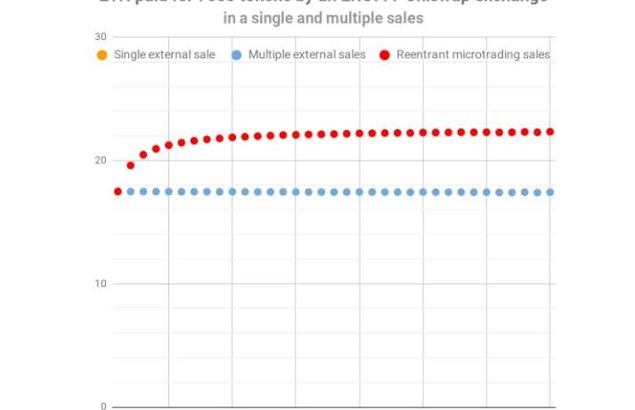 正常操作下,在隨后的常規token售出之后,代幣的儲備將增加,而以太坊的儲備將減少。因此,在每輪售出后,token支付的金額將減少。相反,通過利用可重入性,此動作將有效地防止儲備的代幣數量增加,從而將等式的分母變成常數。請注意,儲備中的ETH數量仍將減少。從長遠來看,我們將能夠獲得一個可觀的利潤,重入迭代次數越多越好。我們將這種攻擊稱為“可重入式微交易”攻擊。該漏洞在代碼中的表示為下圖,攻擊者能夠將利潤提高27%以上。