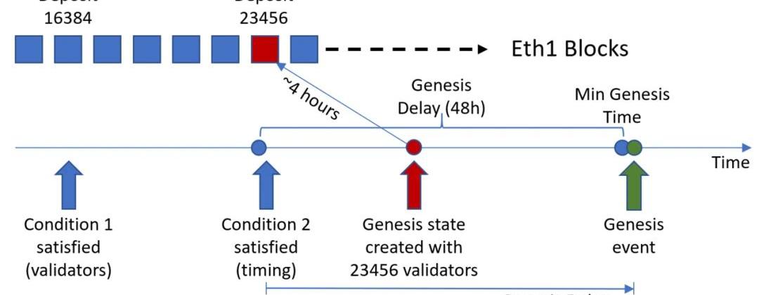 創世狀態是在首個滿足以下兩個條件的ETH1.0區塊的基礎上生成的:這個區塊創建時,驗證者人數不得低于16384。時間戳沒有過早。根據上述兩個條件的滿足順序,創世流程可以通過以下兩種方式完成:1.先達到最低保證金要求