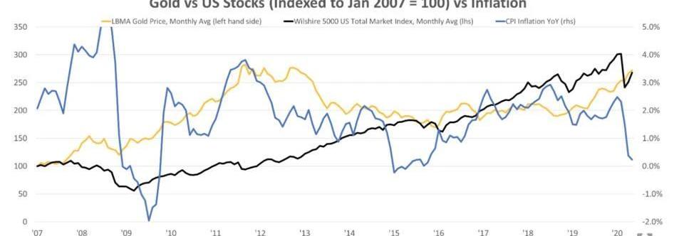 不僅如此,世界各國的動蕩也在不斷加劇,在過去的幾個月中,美國經歷了自上世紀六十年代以來最大的社會動蕩。在新冠病疫情之后,美聯儲開始實施大規模經濟刺激政策還增加了貨幣供應量,結果顯而易見:美國原本很高的債務水平將會再次被推高。事實上,無論采用何種方式削減債務,美國債務都處于有史以來的最高水平,而與此同時數百萬人失業,世界各地的供應鏈都已中斷。JumpCapital因此判斷,當前全球經濟環境可能會引發未來幾十年的通貨膨脹或動蕩。還需要注意的是,惡性通貨膨脹并不是人們尋找諸如黃金和比特幣之類價值儲備對沖的先決條件。下面的圖表展示了2008年金融危機和隨后多輪量化寬松之后發生的情況,在2008-2013年期間,盡管CPI通脹有所上升,但從未超過4%,但黃金在回報表現上明顯優于股票。另一方面,通貨膨脹率穩定上升至3-4%,這些因素將是增加流入黃金和比特幣等價值存儲的重要催化劑,考慮到最近美國債務激增和貨幣增發,比特幣和黃金價格上漲并不牽強。