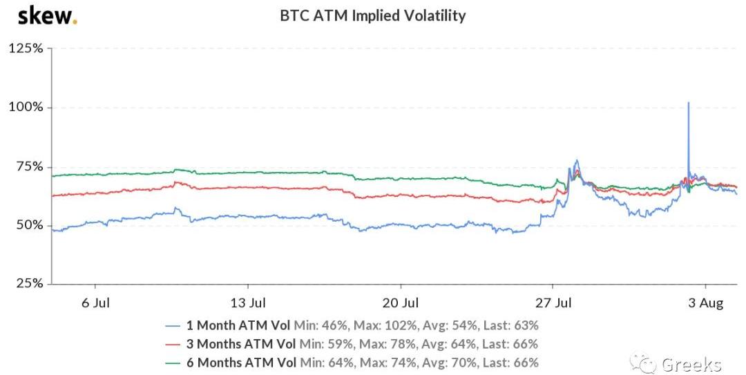 BTC歷史波動率10d83%30d52%90d58%1Y81%持倉量13億美元,期權成交量0.99億美元。目前是縮量整理走勢,市場在等待下一次方向。各標準化期限隱含波動率:今日:1m63%,3m66%,6m66%8/3:1m65%,3m67%,6m67%今天早上有一次200美元的畫門。長期和短期的波動率接近,市場多空雙方力量趨于均衡。