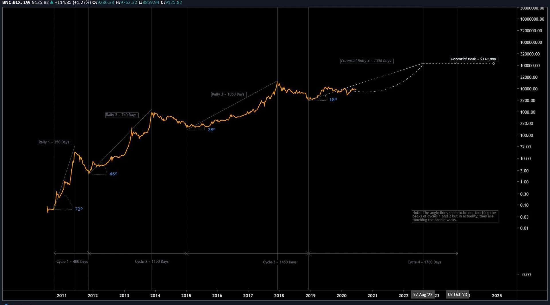 要想理解“牛市什么時候來”,首先需要對BTC作為一種資產的表現有一個簡要的了解。比特幣和股票一樣,也會經歷周期:牛市和熊市一起構成了一個周期。到目前為止,比特幣已經經歷了3個周期,即3次牛市和3次熊市。根據上圖顯示,第一個周期共持續400天,第二個周期為1150天,第三個周期為1450天。顯然,每一個完整周期所需的時間一直在增加,因此,尚未出現的牛市反彈可能仍然需要一些時間。