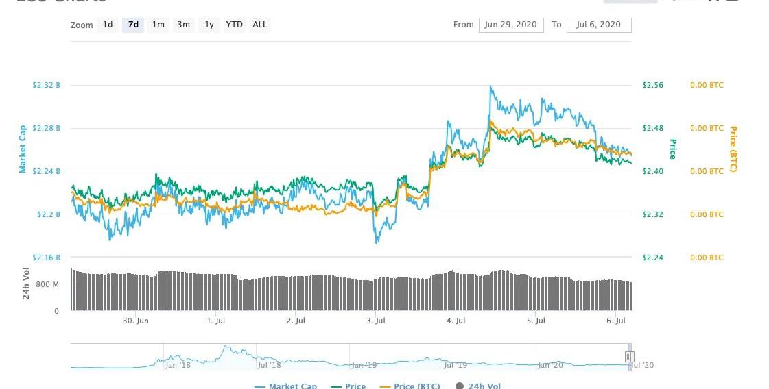 圖源:Coinmarketcap據CMC數據,上周EOS以2.37美元開盤,以2.41美元收盤,周內漲幅達1.6%。當前,EOS排名全幣種排行榜第11名。EOS現報2.38美元,24小時跌幅為3.08%,當前市場情緒顯示多空人數比高位,多空比為1.74,全網多空合約中空頭占比達55%。技術