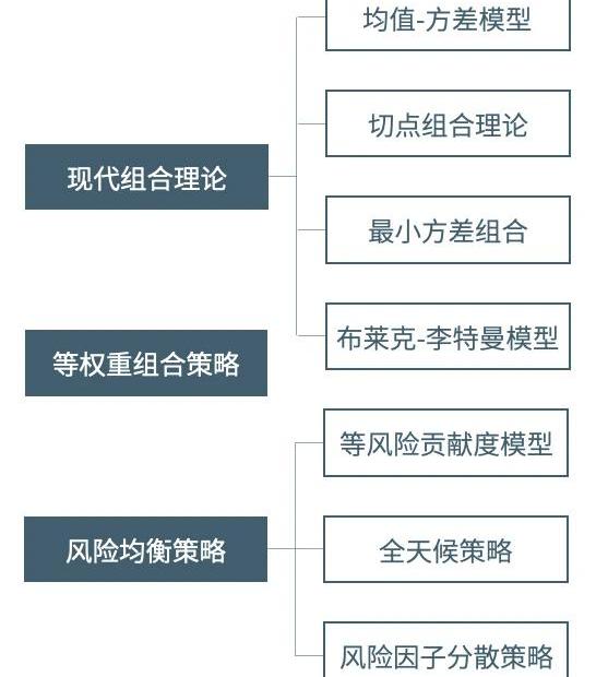 隨著數字資產量化基金行業的發展,如何構建基金組合的討論日益增多,市場對FOF管理人的專業要求也日趨嚴格。傳統金融市場中的資產配置策略大致可劃分為現代組合理論、風險均衡/平價策略以及等權重組合策略。現代組合理論和風險均衡理論下又有細分。下圖展示了不同理論下的代表性模型: