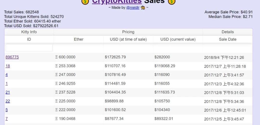 加密貓的上線就像丟出了一枚核彈,令人咋舌的狀況接踵而至:12月2日,上線第4天,編號為1的創世貓被以將近247ETH的價格賣出。說句題外話,如果價格按照ETH計算,那么這只創世貓只能屈居第四,截止到目前為止,最貴的加密貓價值600ETH。