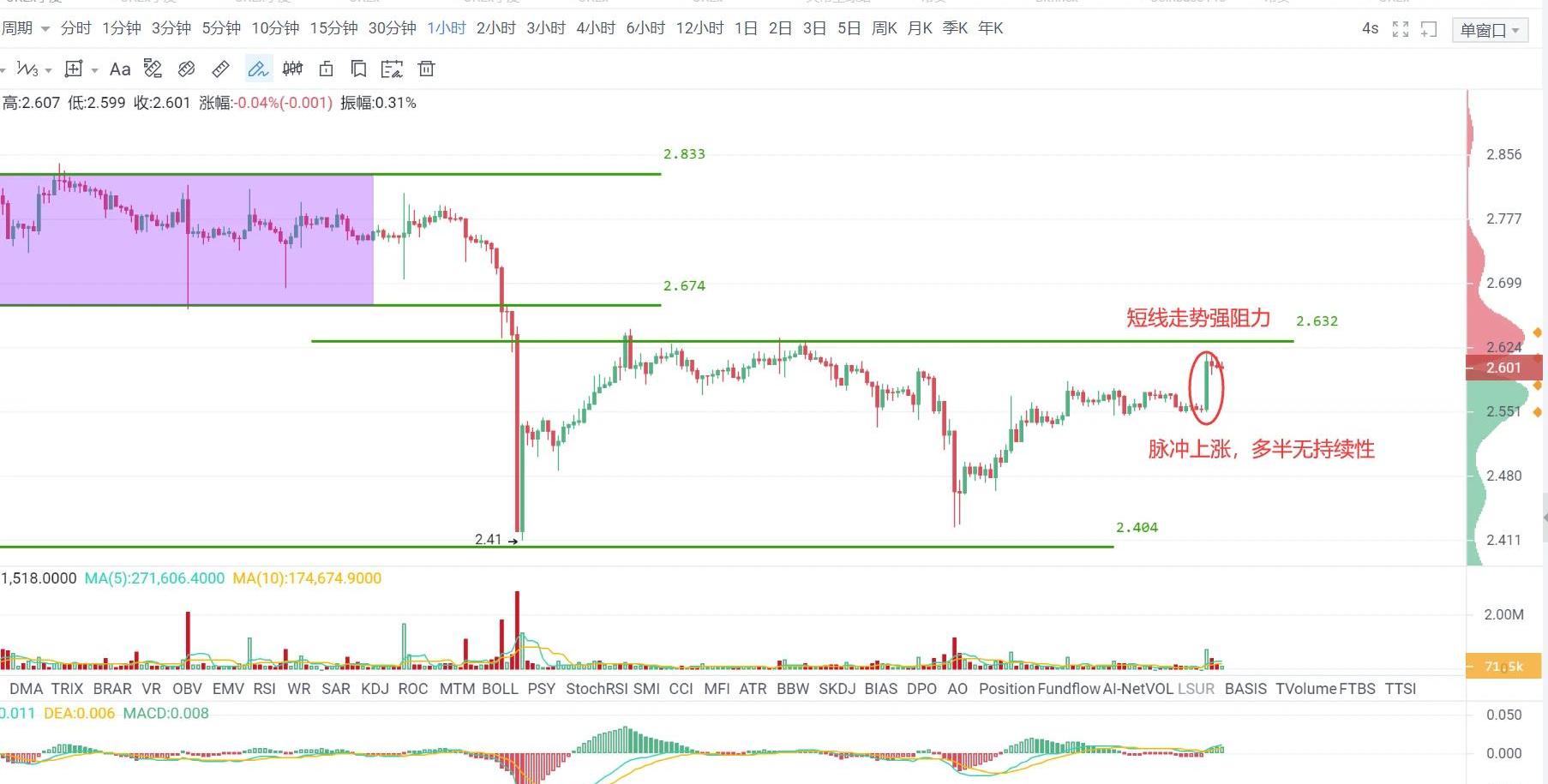 各級別性質:日線-下跌,4小時-盤整,1小時-下跌截圖來自OKEXEOS季度1小時圖:目前的客觀走勢及應對策略:包括EOS、LTC、BCH等在內的幾個主流幣稍早前出現了一波短線脈沖式上漲,有點補漲的意味,不過從圖中可以看出一根陽線后立刻疲態盡顯,主動性買盤無持續性,建議盡量避免追高介入。目前幣價已經來到了近日關鍵阻力2.63附近,看似價格馬上就要突破此價位,但縱觀歷史你會發現10次同類型的走勢有一多半最終都沒有上破成功,所以從概率上講現在去做多單博弈風險收益比不合適。退一步講,即便后面上破成功了,多半也都是有機會再次跟進的,突破后一飛沖天的情況有,但只占極小比例。只要你的本金在,市場中的機會多多,但是要做取舍,選擇那些成功概率更高的機會博弈。不過已經獲利的多單還是可以考慮繼續持有的,設一個止損在這根拉升陽線的低點下方,錯了少賺一些,繼續漲就獲得超額收益。在資本市場很多時候你賺的錢并不是你預測到了,而是靠一些正確的投資思想。主觀預期:預估有效上破2.63概率較小,個人認為可能性偏大的一種走勢是幣價短暫上破2.63后沖高回落繼續維持自6月2日以來的弱勢格局。本段不作為交易策略參考。阻力與支撐阻力:2.63--2.68--2.76支撐:2.54--2.48--2.40免責聲明:本專欄內容概不構成任何投資意見,內容亦并非就任何個別投資者的特定投資目標、財務狀況及個別需要而編制。投資者不應只按本專欄內容進行投資。在作出任何投資決定前,投資者應考慮產品的特點、其本身的投資目標、可承受的風險程度及其他因素,并適當地尋求專業意見。