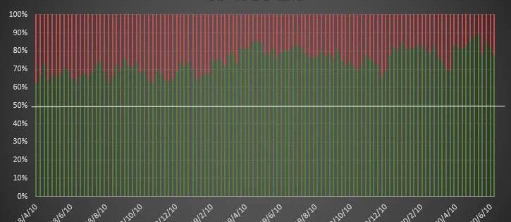 分項數據上來看,規模較大的經紀商持倉多頭頭寸自435張回落至406張,空頭頭寸自214張躍升至294張,該數值創出今年4月21日以來新高。此前一直保持強烈看漲態度的經紀商賬戶在最新統計周期內進行了比較罕見的凈空調倉,而且有一點值得強調的是,這種凈空調整中多倉的減持幅度并不大,這也意味著所謂的多單獲利了結并不是這類賬戶短線態度扭轉的主要原因,相比之下空頭頭寸快速反彈創出近八周新高的表現更值得重視。「經紀商賬戶『死多頭』的態度是不是要轉變了?」將成為未來一到兩周COT周報的關鍵點。