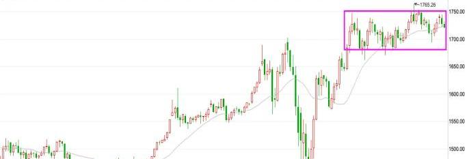 國際黃金價格自4月13日站上1700美元/盎司關鍵阻力位后,開始長達近2個月的高位盤整,期間一度觸及自2012年以來的史上高位1765.26點。技術形體上看,MA20呈現水平態勢,構成當下金價走勢中樞,價格沿下軌1685美元/盎司和上軌1750美元/盎司構成的箱體展開震蕩。