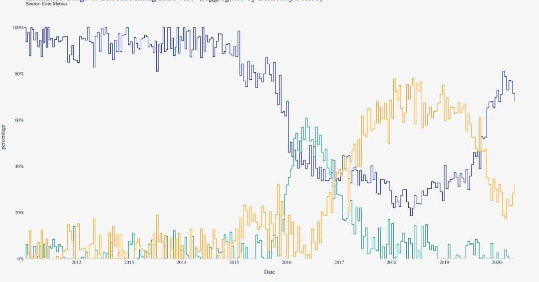 BTC的表現已經連續三周超過了其他數字貨幣資產,并形成了一個不可忽視的趨勢。雖然不能排除這種趨勢只是價格隨機游走的結果,但一個看似合理的解釋是,BTC的儲值屬性在當今的市場環境中越來越重要。而且隨著我們觀察到機構投資者越來越多地將BTC納入投資組合中,BTC也自然成為了機構投資者尋求數字貨幣投資的首選,并最終導致的數字貨幣資產作為一個獨立的資產類別被采用。