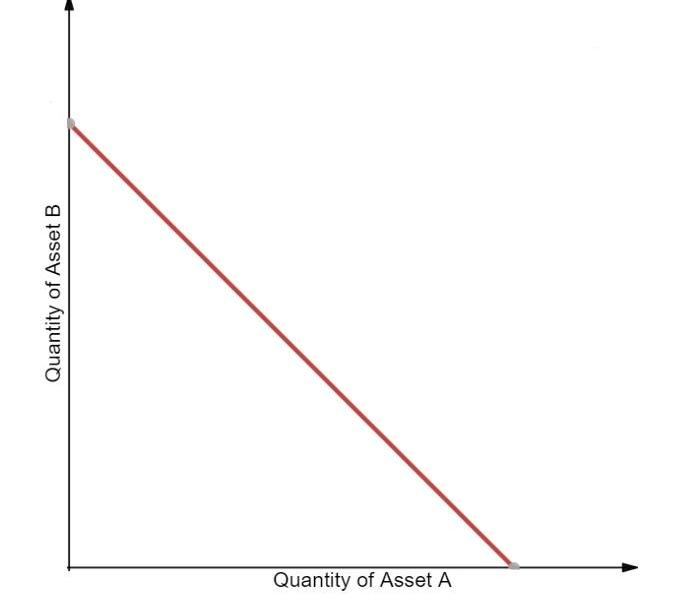 當我們去繪制在恒定總量模式下的兩個資產A和B的關系時,會呈現構成一條直線。進而得到方程x+y=k。恒定均值收益型做市商