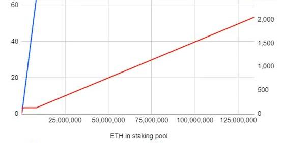 上式中Eth2是轉移到PoS的代幣數量。該公式背后的想法是,Eth1轉入Eth2的數量越多,發行的新幣就越多,然而,可獲得的投資回報率會下降,因為被押注的幣越多,可獲得的投資回報率就會下降。我們可以從下圖中看到通脹率的變化。